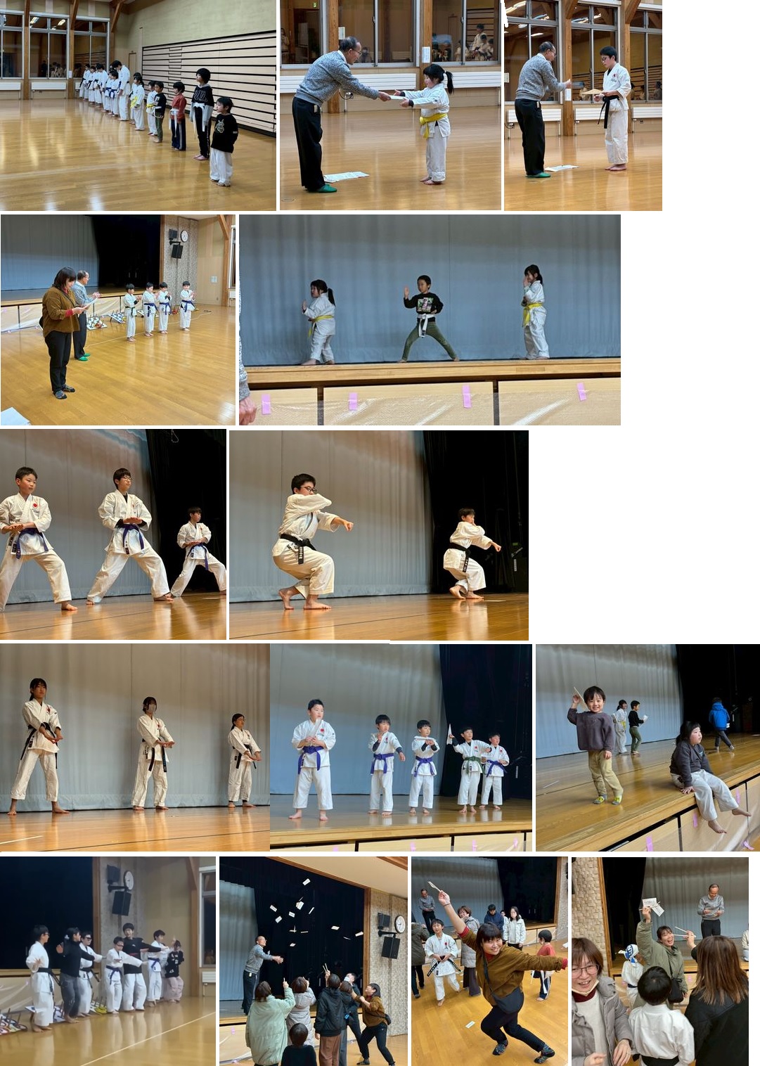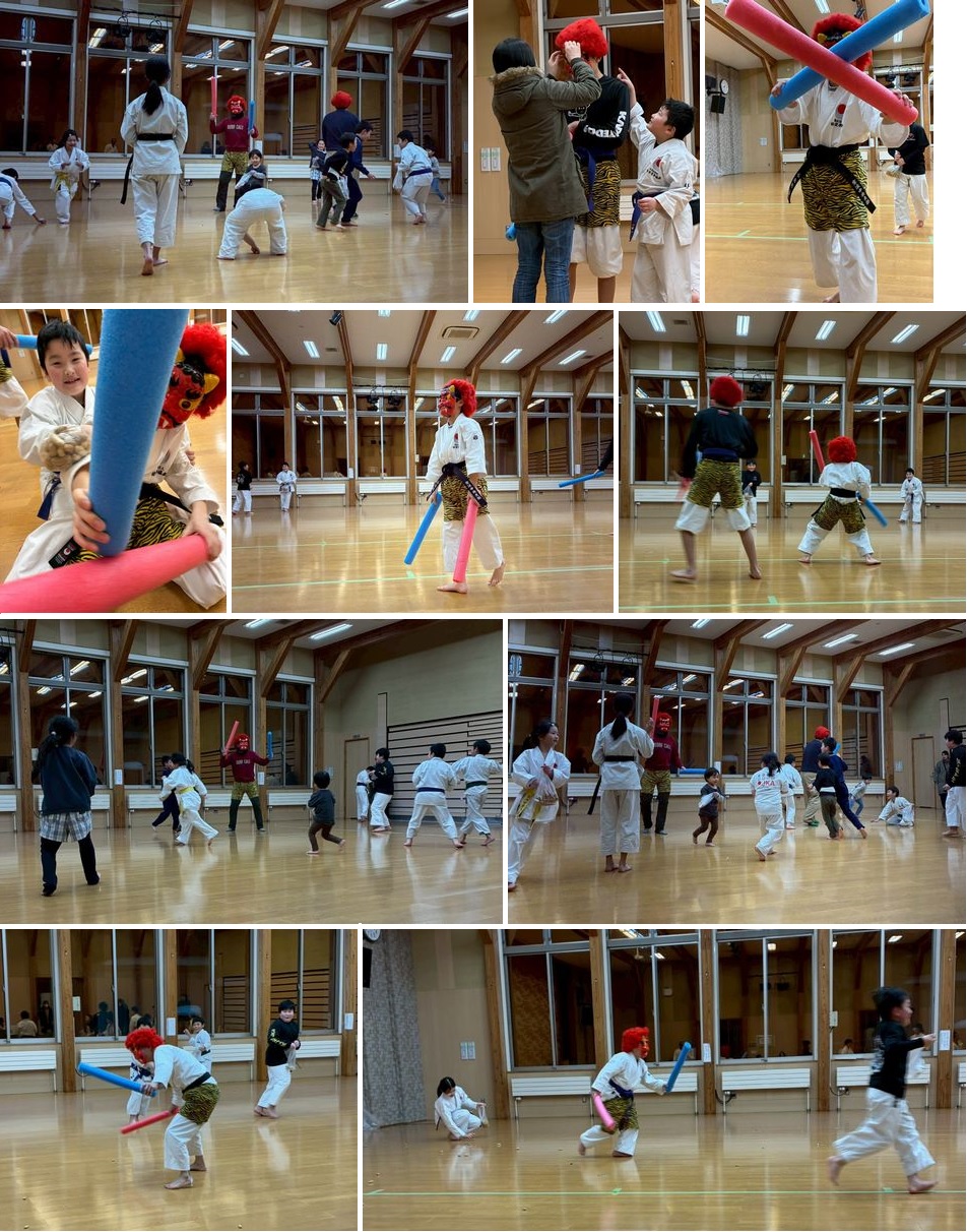 令和8年1月23日、お楽しみ会を実施しました。開会式の後、多く出席した人、指導を頑張った人を表彰し、全員が今年の目標を発表しました。その後、日頃一生懸命稽古した型を披露し、最後は、お楽しみのゲーム(輪投げ、紙飛行機飛ばし、出し物、ヒラヒラキャッチ)を満喫しました。